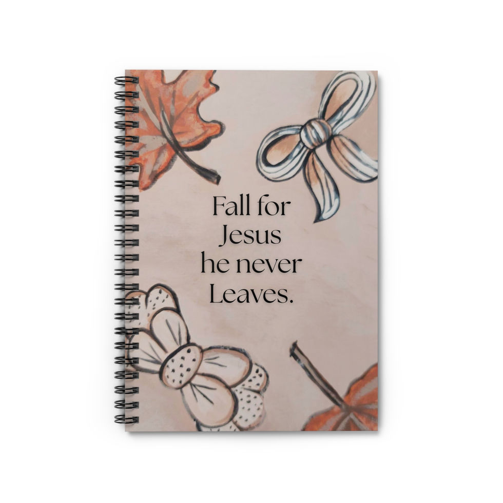 This spiral notebook makes a thoughtful and beautiful gift for anyone who loves the autumn season and holds their faith dear. The cover showcases the sweet message, "Fall for Jesus, he never Leaves," surrounded by elegant, simple fall foliage artwork. Use it as a planner, a creative journal, or a lovely piece of Christian stationery. Its inspiring design and practical size make it a wonderful way to brighten a backpack, desk, or bedside table during the fall months.